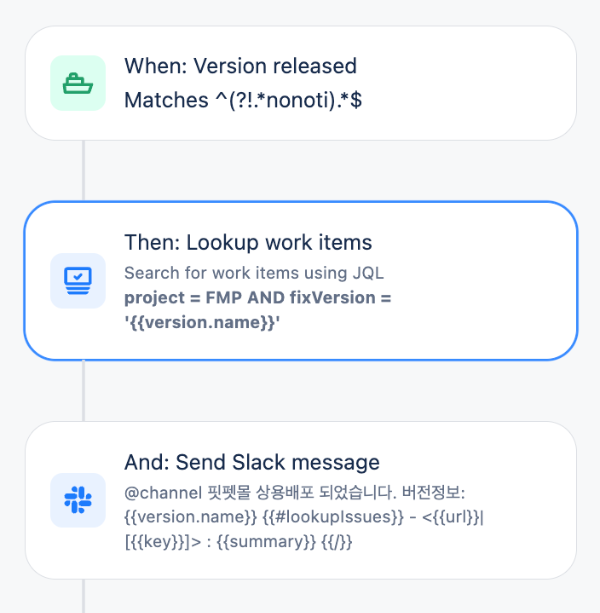 릴리즈 버전을 하나로만 관리하는 경우 지라 자동화 기능만으로도 충분히 커버가 가능하지만, 복수의 릴리즈 버전을 사용과 태스크별 버전 관리를 커버가 어려워서 추가로 간단한 API를 개발하여 GitHub Actions와 연동하는 방식을 선택하였다.