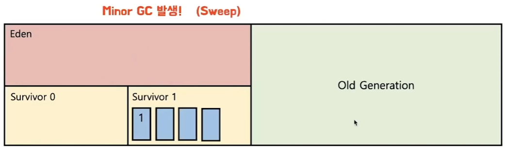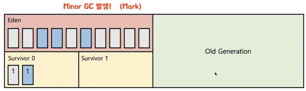 6. 시간이 지나서 Eden 영역에 생성된 객체들로 차게되면 다시 Minor GC가 실행되고 다시 3-5 과정을 수행한다.