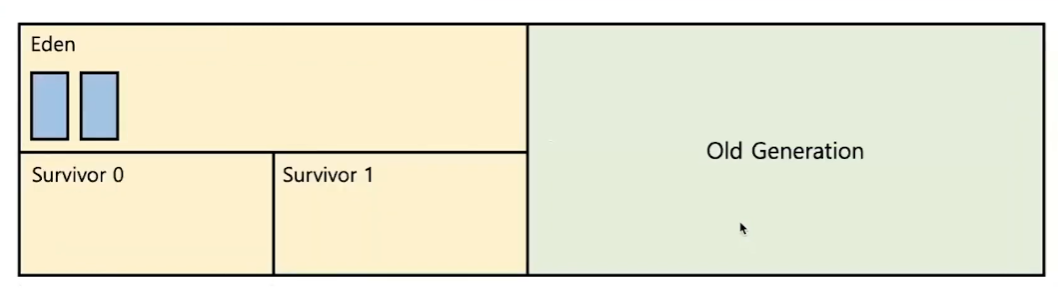- Young Generation: 새로 생성된 객체가 위치, 대부분의 객체는 여기서 생성 후 바로 수거(GC)