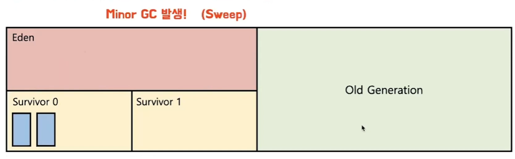 6. 시간이 지나서 Eden 영역에 생성된 객체들로 차게되면 다시 Minor GC가 실행되고 다시 3-5 과정을 수행한다.